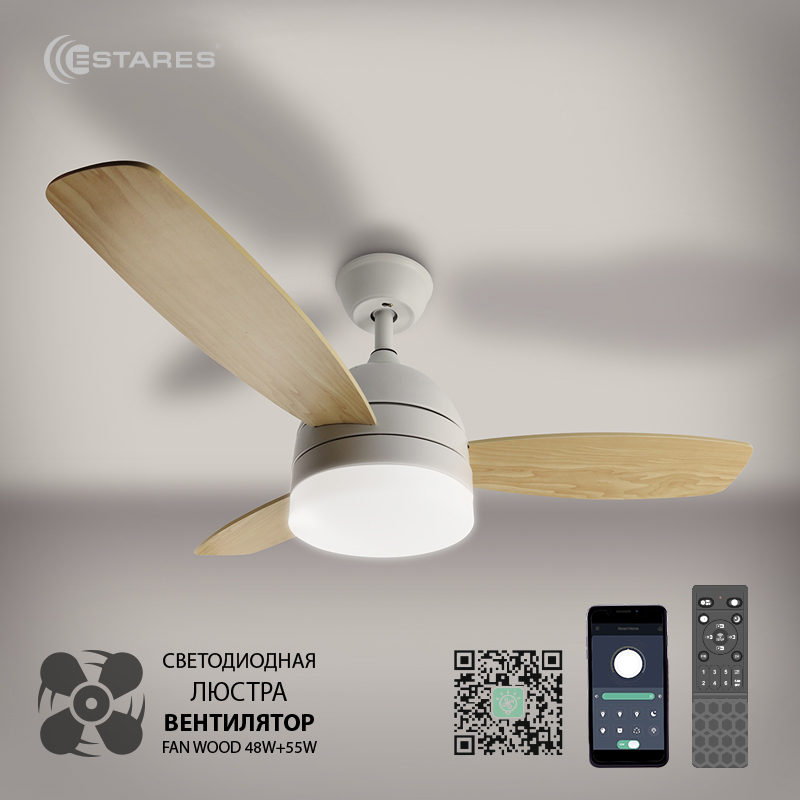 Управляемая светодиодная люстра с вент. FAN WOOD 48W+18W R-APP-1060x390-WHITE/WOOD/WHITE-220-IP20